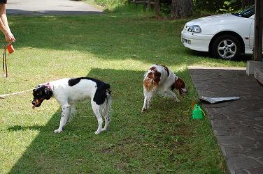 ネネちゃんも水遊び。後ろからココちゃんが様子見 |
