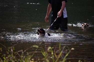 この暑さなので、この日も川遊び。パパさんと堰へ向かうジル。危ないよ |