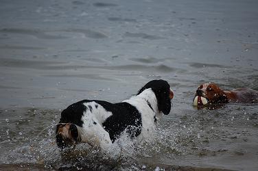ジルのボールを波打ち際で狙っているネネちゃん。 |