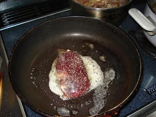 鴨胸肉は、コショウをまぶし、いつものようにバターでソテーします。 |