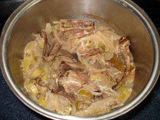 今回の主役は鴨のガラ。 ソース材料 香味野菜・・有り合わせ(今回は、たまねぎ、セロリの葉、パセリ、ローリエ、長ネギを使用) 白ワイン・・3カップ |