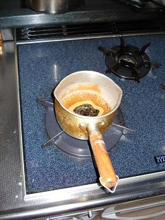 醤油、みりん、酒を小鍋に入れて一煮立ちさせます。 |